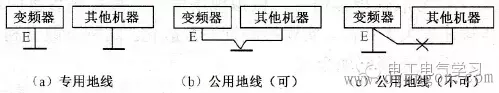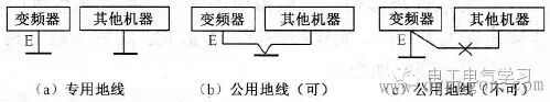 ④变频器系统接地的主要目的是防止漏电及干扰的侵入或对外辐射。回路必须按电气设备技术标准和规定接地,采用实用牢固的接地桩。变频器的接地方式如图所示。图 (a)所示方式最好,图(b)所示方式中其他机器的接地线未连到变频器上,基本可以,图 (c)所示方式则不可。